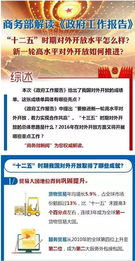 《政府工作報告》中提出“要推進(jìn)新一輪高水平對外開放,著力實現(xiàn)合作共贏”。“十三五”時期對外開放的總體思路是什么?2016年在對外開放方面又將開展哪些重點工作?“商務(wù)微新聞”為您權(quán)威解讀。